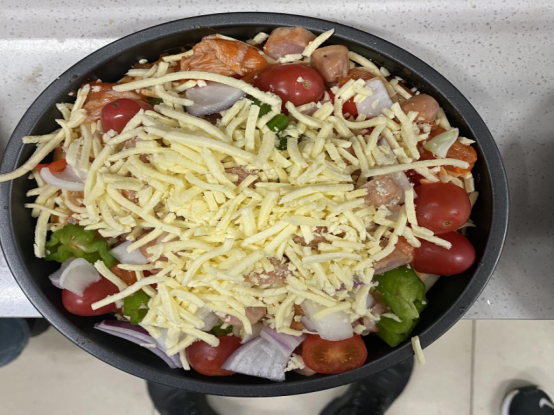 活动开始,各位老师就分头行动起来,有的洗菜切菜,有的调酱料,有的预热烤箱,活动在相互协作,热闹有序的氛围中进行。各种各样的食材铺满饼皮,经过时间和温度的催化,一个个烤饼新鲜出炉,空气中弥漫着浓郁的香味!