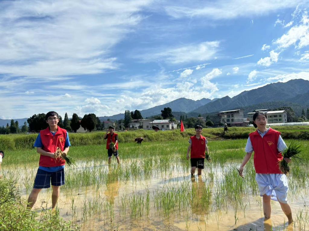 乡村振兴,助农插秧。在稻田里,志愿服务队的队员们认真地学习了插秧的手法以及注意事项后,撸袖卷裤,下田劳作,大家相互协作,干劲十足,为一块块空荡荡的水田换上了崭新的“绿装”。助农的同时,也厚植了同学们知农爱农的情怀,感受“一粥一饭当思来之不易”。