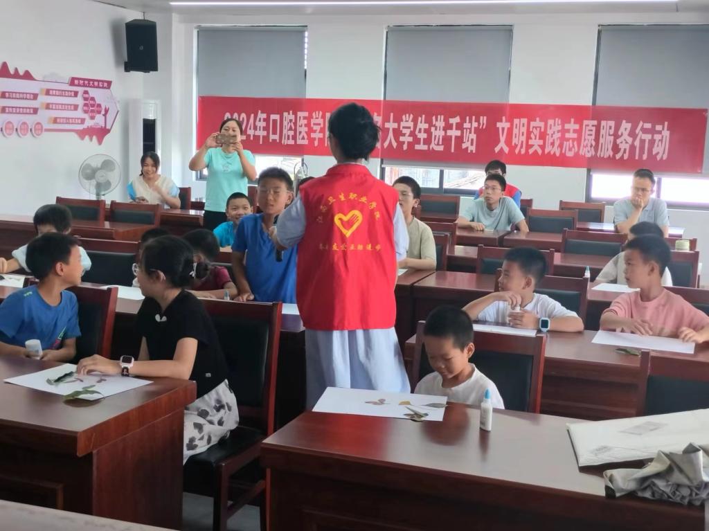 乡村振兴,筑梦童心。志愿服务队教育帮扶课堂活动围绕文化知识科普、亲情陪伴、素质拓展等,通过互动游戏、实践操作、情景陶冶等多种教学模式为当地孩子们进行授课,在“创意树叶贴画”和“口腔保健”课程中,寓教于乐,让孩子们得到了锻炼和成长。