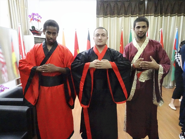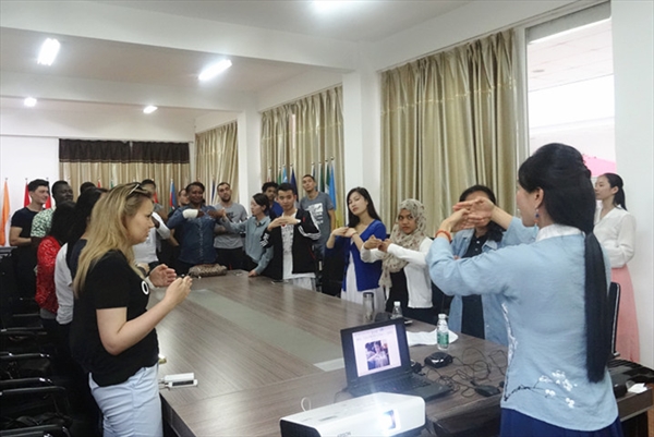 活动伊始,傅老师身着汉服,在《礼仪之邦》的歌声中悠然而至,举手投足间散发出独特魅力。傅老师首先向留学生简单介绍了汉服的相关知识,汉服是中国汉民族传统服饰,有“华夏之冠”的美称。汉服的特点是“交领右衽,上衣下裳”,体现了中国文化与人为善、人与自然和谐的特征。傅老师还用生动有趣的形语言介绍了中国古代的日常礼仪,并亲自示范,让留学生体验拜礼和揖让礼。介绍结束后,傅老师进行了古琴表演,充满神韵和魅力的传统音乐吸引了全场同学的目光。一曲结束,掌声不断,来自乌兹别克斯坦李智和加纳的Chandoo对古琴产生了浓厚的兴趣,在老师的指导下小心翼翼地拨动琴弦,但弹出来的曲子却是杂乱无章的,让其他同学大笑不已。