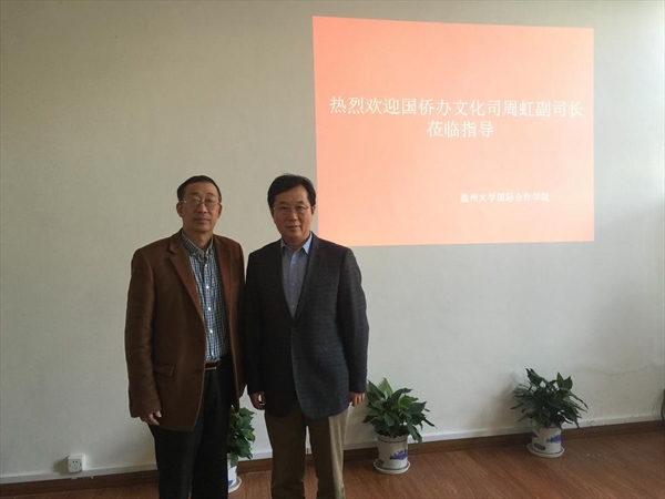 严晓鹏院长向周虹副司长介绍了英国正版365官网作为国侨办华文教育基地,近十年来积极开展华文教育实践与研究的工作情况,具体介绍了“寻根之旅”海外华裔青少年夏令营、优秀华裔青年营、海外华文教师培训班和华侨生学历教育的办学经验和成果,以及开展华文教育研究和世界温州人研究情况。此外,英国正版365官网还一直与海外华文学校和华文教师保持密切联系,积极捐赠汉语教材,关心华文教师的在海外的工作和生活,并为华校和华文教师提供各种后续咨询、服务等实实在在的帮助。