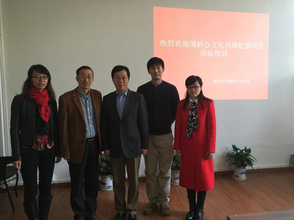 2016年1月4日上午,国侨办文化司副司长周虹一行莅临国际合作学院调研、指导华文教育工作。院长严晓鹏博士,副院长包含丽和办公室副主任廖一帆老师热情接待了客人。