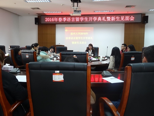2016年3月11日下午14:30,我校2016年春季语言留学生开学典礼暨新生见面会在南校区岩松堂展示厅举行,国际合作学院副院长包含丽、汉语推广教研室负责人、学院相关科室负责人及教师代表出席了典礼,郑婷老师主持典礼。