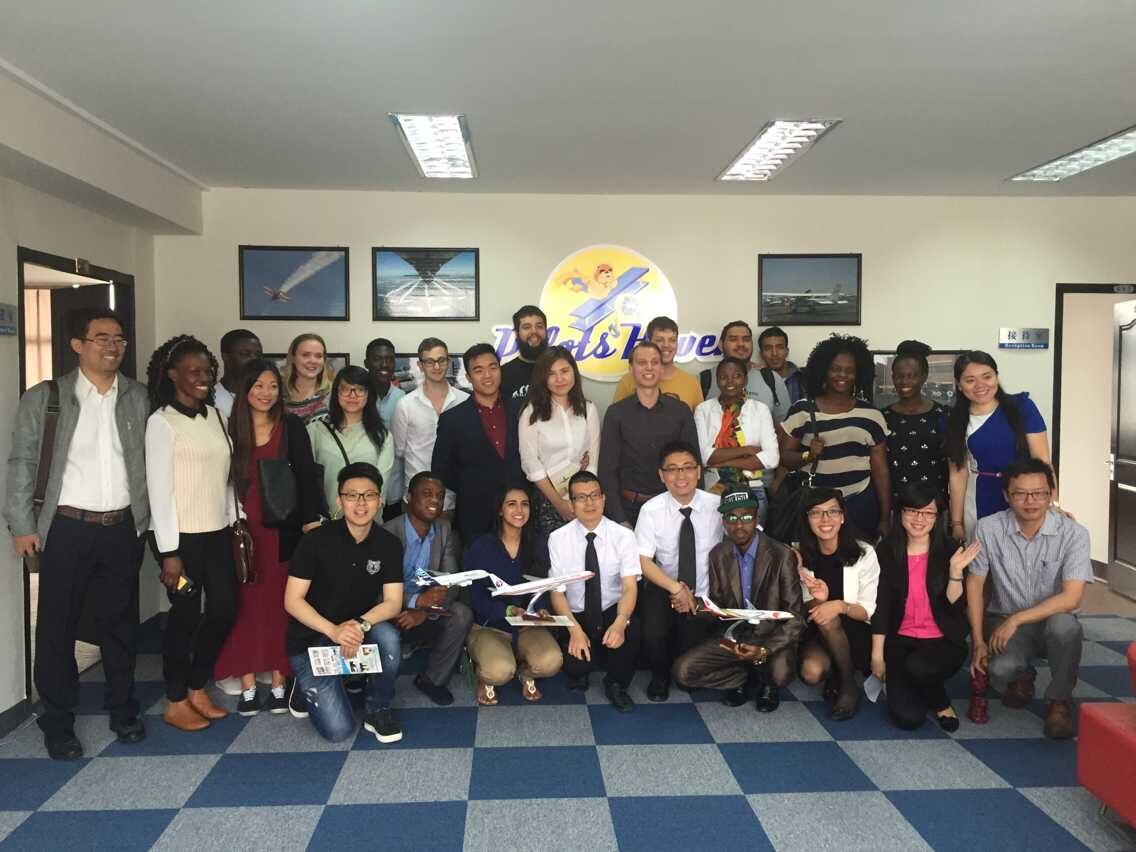 图为市人大常委会副主任高柱、副市长郑朝阳在英国正版365官方网站国际合作学院院长严晓鹏的陪同下参观飞行俱乐部 林彬彬摄