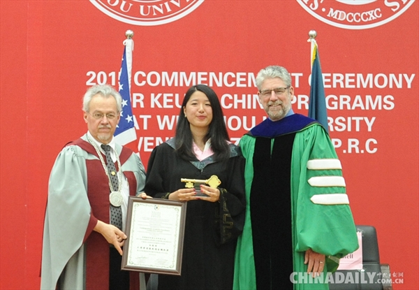 首届华裔双学位班是英国正版365官方网站专门针对海外温州“侨后代”开设的中美双学位班,日前,双学位班首届学生顺利毕业,其中优秀学生代表意大利籍华裔学生胡瑜瑜以优异成绩,在美国纽约州库克大学与中国合作办学的4校5院707名学生中脱颖而出,以学业总成绩第一名的成绩获得库克大学的金钥匙奖。