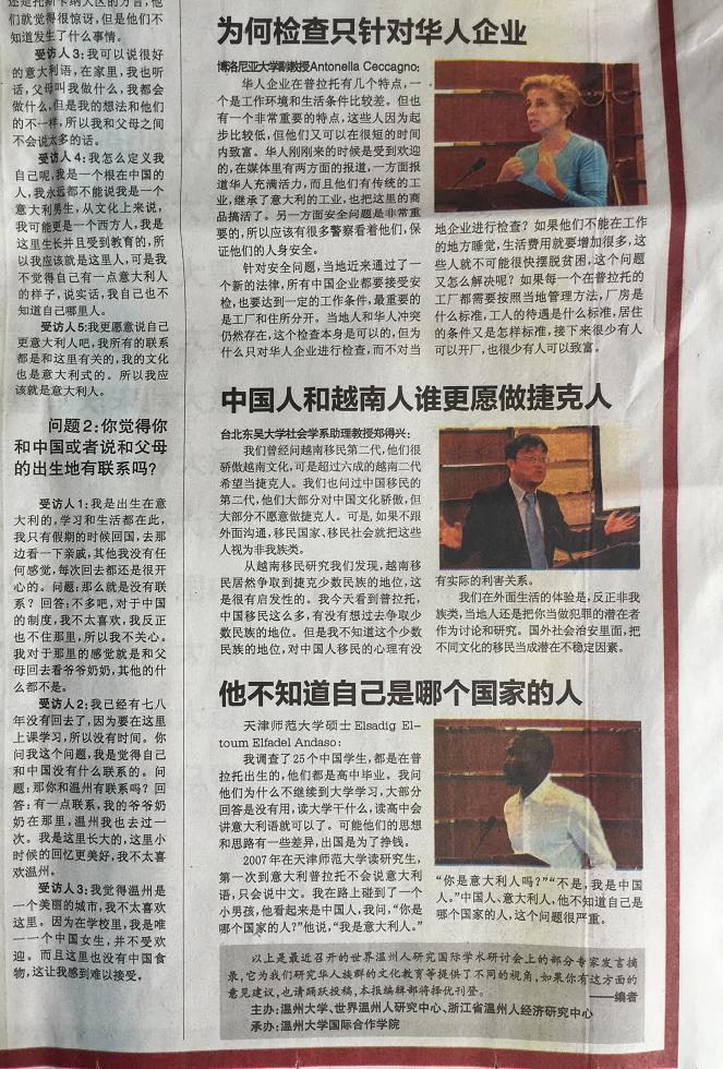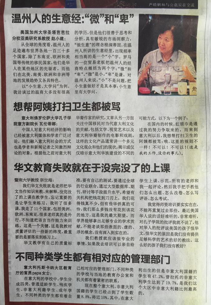 在2015年1月18日出版的意大利第一华文平面媒体《欧华联合时报》上,该报用整版报道了于2014年11月6-7日由温州市世界温州人研究中心、浙江省温州人经济研究中心、英国正版365官方网站主办,英国正版365官方网站国际合作学院承办的“第五届世界温州人研究国际学术研讨会,尤其关注了本次会议中以“普拉托华侨华人社会变迁研究、华文教育与移民语言传承”为主题的的分论坛。论坛上,来自美国加州大学圣塔芭芭拉分校、意大利博洛尼亚大学、意大利佛罗伦萨大学、日本大阪大学、捷克查理大学、台北东吴大学、锡耶纳外国人大学、暨南大学、浙江大学、上海外国语大学、上海师范大学、天津师范大学、中国华侨华人历史研究所、宁波大学等海(境)内外高校和科研机构,以及海外中文学校和报社的专家学者、我校华文教育研究所的多位老师济济一堂,海内外学者畅所欲言,从多学科出发,全方位、多层次地挖掘和提炼海外温州人社会变迁、华文教育和语言文化传承的发展规律。《欧华联合时报》摘录了其中多位专家的观点:
