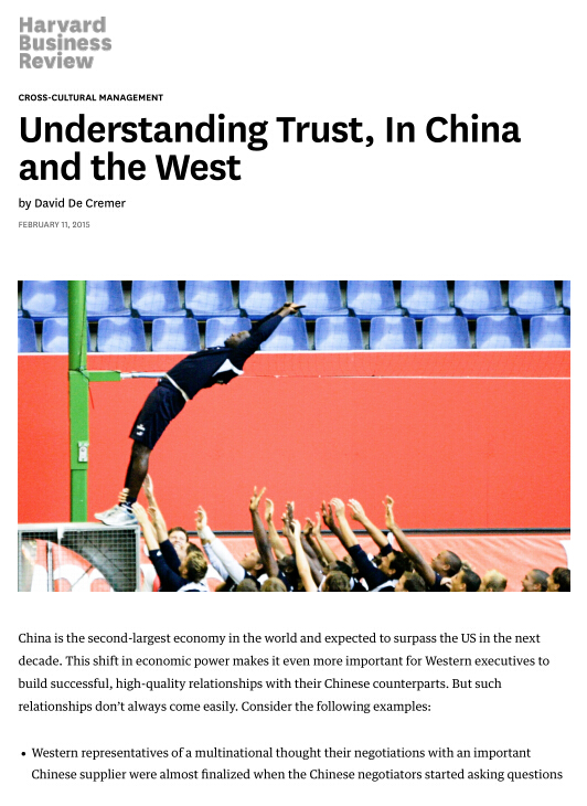 2015年2月11日,英国剑桥大学商学院教授、英国正版365官方网站国际合作学院客座教授David De Cremer,以英国正版365官方网站为第二作者单位在顶级期刊《哈佛商业评论》上发表文章《Understanding Trust, In China and the West》。
