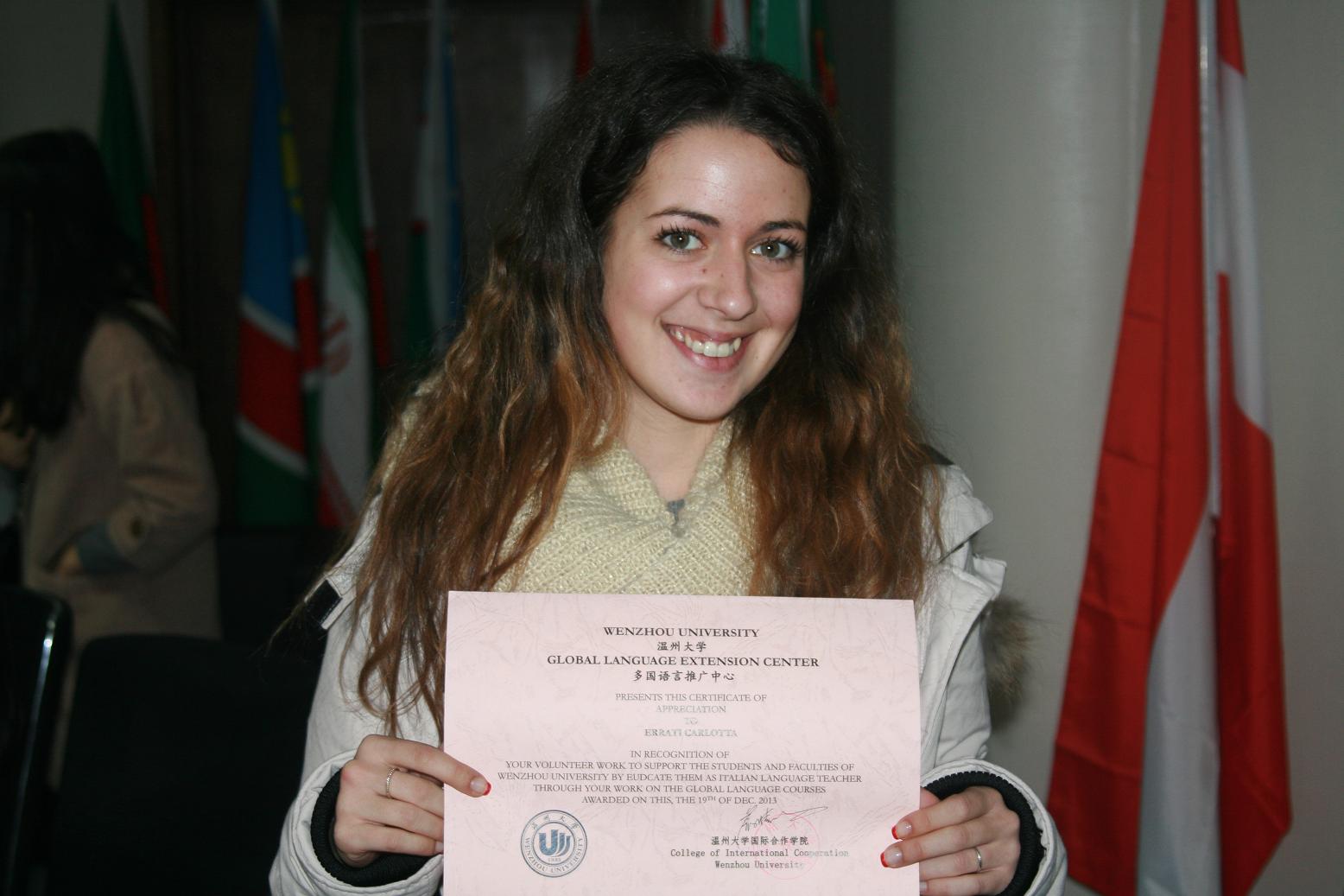 本学期多国语言课程共开设英语、意大利、泰语、西班牙语与法语课共七个班,其中英语课与意大利语课分别开设两个班,并由英国正版365官方网站的两位外语教师与六位交流学者、交换学生承担授课。课程一经开始,便受到我校师生的广大欢迎,先后四百多人积极报名。十多周的课程已经结束了,参与课程的学校老师和学生们的外语水平都有了显著提高,其中37位老师、学生经考核,表现优异,授予结业证书予以鼓励。此次的结业典礼,在鼓励大家学习优异表现的同时,也表达了对授课老师的感谢。其间英国正版365官方网站国际文化交流社社长-刘儒儒,代表社团与多国语言推广中心向参与授课的来华留学志愿者们颁发了感谢状;上课的同学们也纷纷送上了自己的礼品。此外,在典礼过程中,师生们分组讨论并依次分享了对课程的思考与建议;“课程期间应该能举办一些节目,让各国语言交流互动,深入对比”,这是一位法语学生的提议,并受到一致认可,充分体现了大家日趋关注文化的交融。最后,在各国文化的碰撞中,师生们热切交流、交换学习心得,并在所学语种国的国旗旁拍照留念,为本学期的语言学习画上了完美的句号。